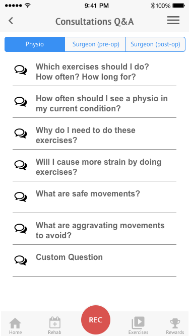 This app is meant for a better way to keep track of the advice from patient’s health professionals through surgeon guidance, physio exercise plan with video capture, personalized medical content and rewards.